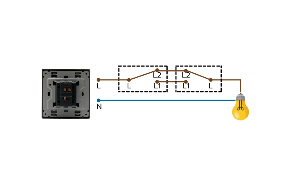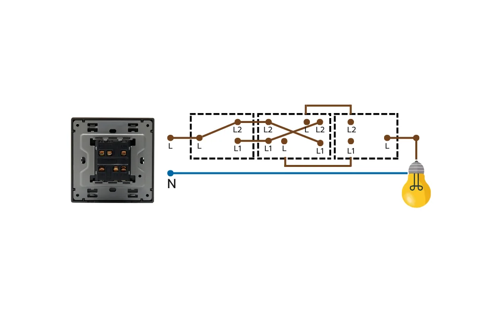 | 3 ทาง | 3 จุด | 3 ตัว (2 ทาง 2 ตัว + สวิตช์กลางทาง 1 ตัว) | Intermediate switch | 4 ทาง | โถงใหญ่, ห้องประชุม |