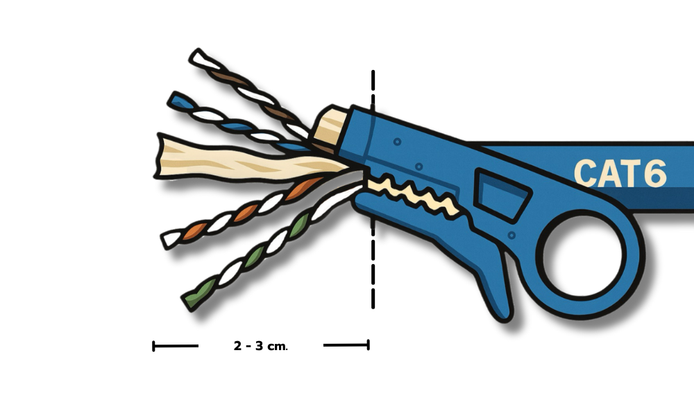 ปอกปลอกสาย CAT6 ออกประมาณ 2-3 ซม. แยกสายออกเป็นคู่ตามสีมาตรฐาน เช่น ขาว-ส้ม/ส้ม, ขาว-เขียว/เขียว ฯลฯ